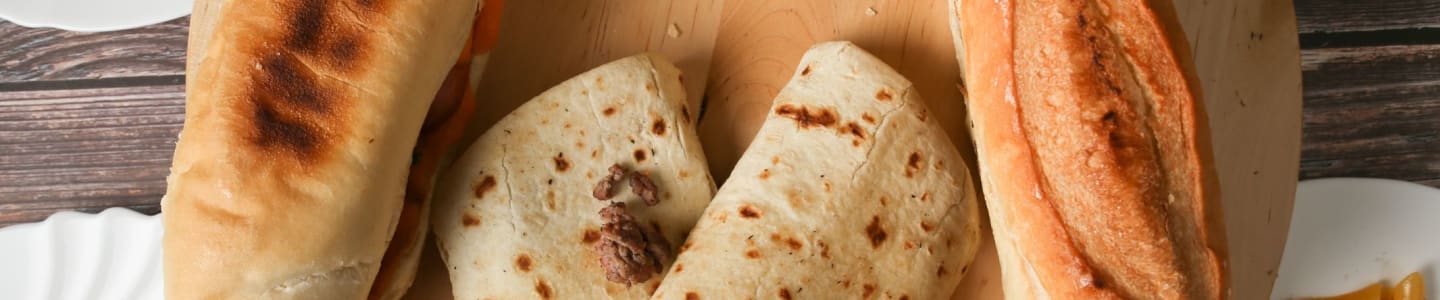 baguette con una saporita polpetta di manzo, formaggio cheddar, insalata e salse a piacere