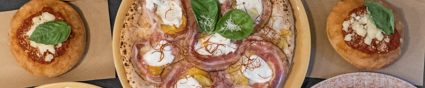 pomodorini gialli, mozzarella di bufala, formaggio, pancetta, fili di peperoncino e basilico
